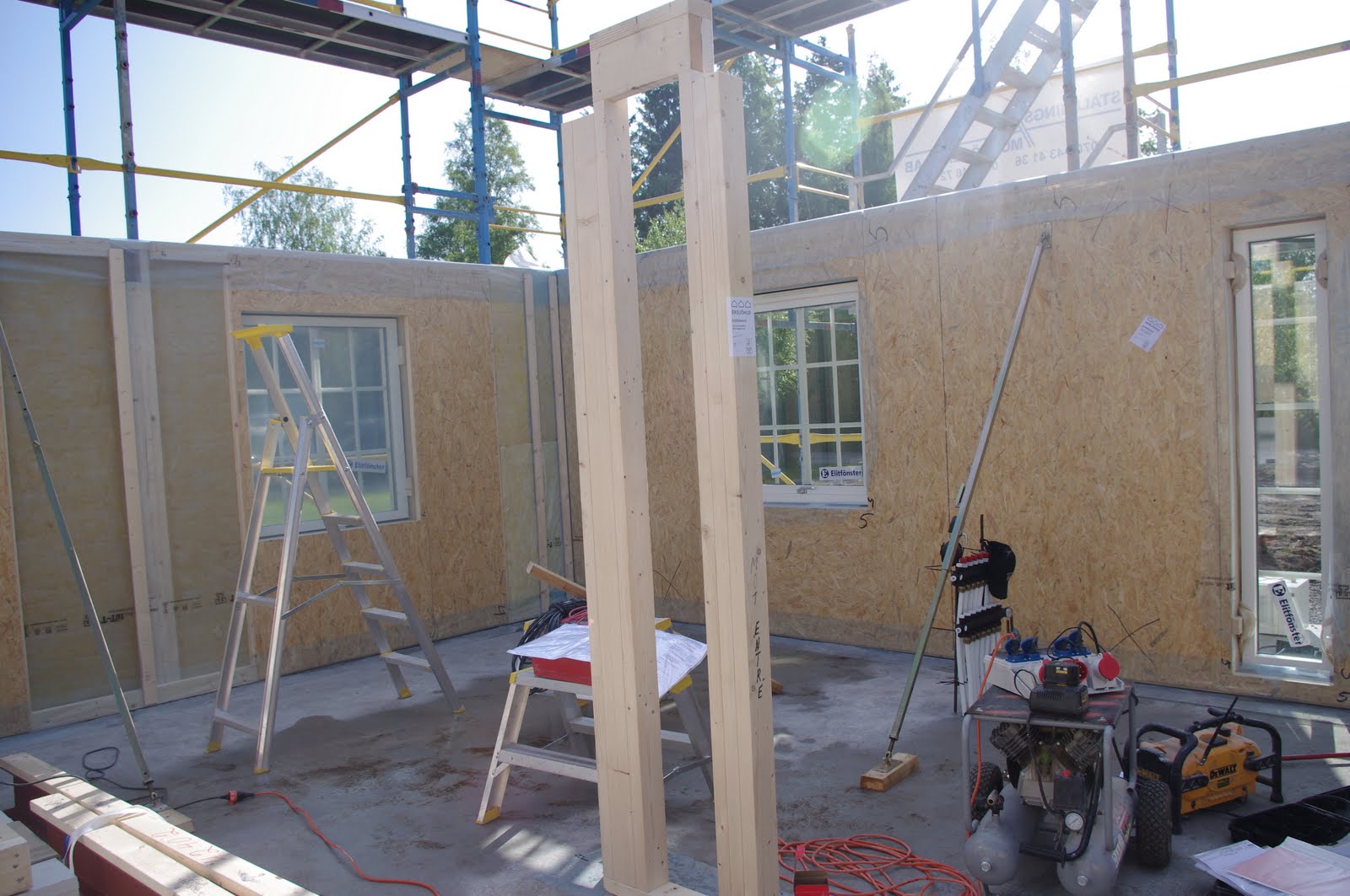 Klockan 07.00 hade vi fått veta att huset skulle komma! Vi va på plats 08.00 o då stod nästan undervåningen klar!! Det va en så otroligt fin morgon o solen strålade . Killarna hade bestämt sig för att jobba hårt o bli helt klara idag eftersom det är regnväder på ingång.